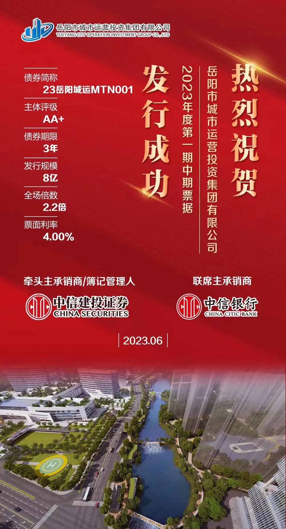 6月4日,岳陽市城市運營投資集團有限公司2023年度第一期中期票據(23岳陽城運MTN001)成功發(fā)行。本期債券發(fā)行規(guī)模為8億元,發(fā)行期限為3年,票面利率為4.00%,采用線上集中簿記建檔方式發(fā)行,牽頭主承銷商為中信建投證券股份有限公司,聯席主承銷商為中信銀行股份有限公司,湖南祈安律師事務所、中審眾環(huán)會計師事務所(特殊普通合伙)、大公國際資信評估有限公司分別提供法律、審計、信用評級服務。