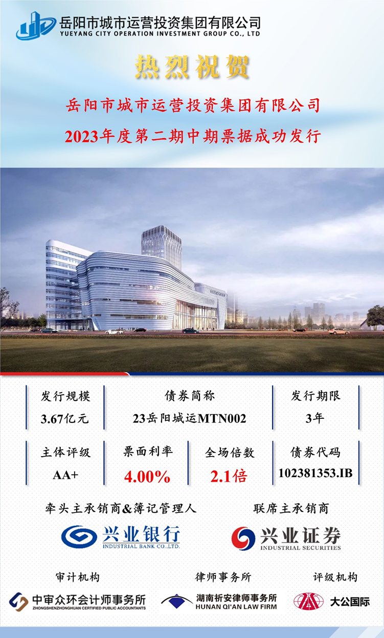 2023年6月7-8日,由岳陽市城市運營投資集團有限公司作為發(fā)行人的岳陽市城市運營投資集團有限公司2023年度第二期中期票據(23岳陽城運MTN002)成功發(fā)行。此次債券發(fā)行規(guī)模為3.67億元,期限為純3年,票面利率為4.00%,采用線上集中簿記建檔方式發(fā)行,牽頭主承銷商為興業(yè)銀行,聯席主承銷商為興業(yè)證券。