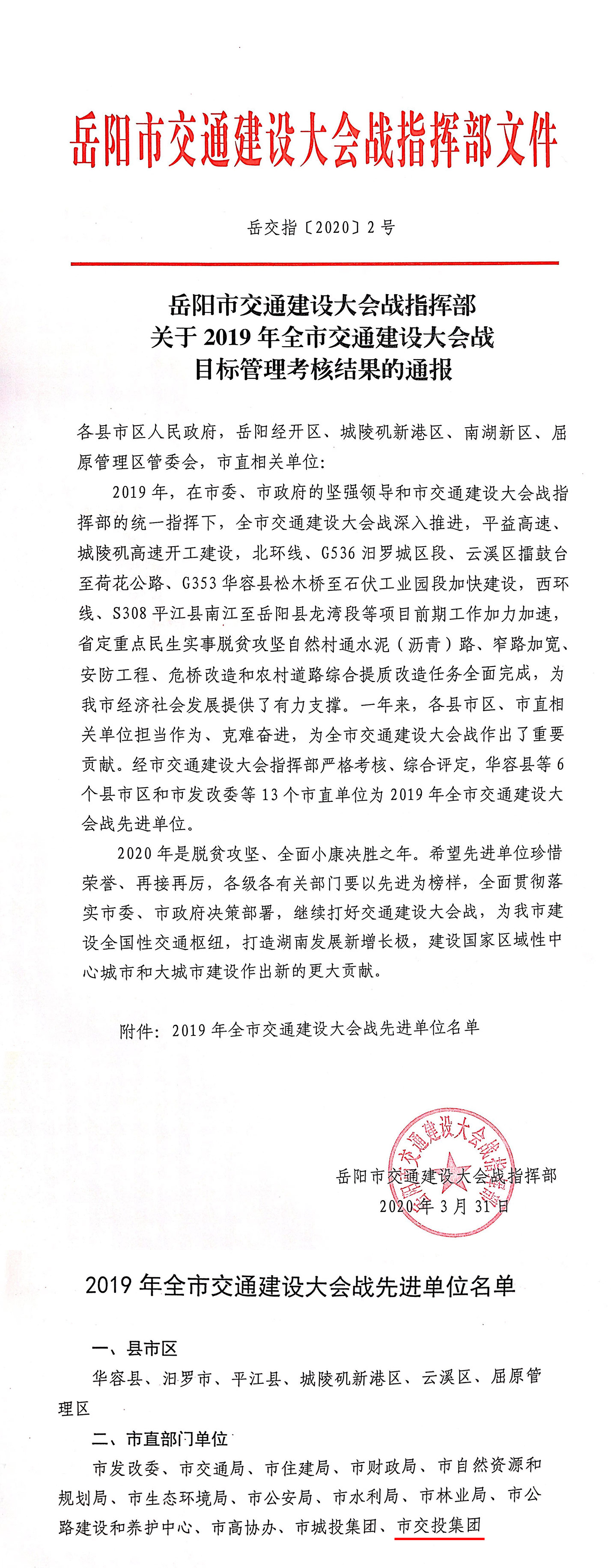 關(guān)于2019年全市交通建設(shè)大會戰(zhàn)目標管理考核結(jié)果的通報