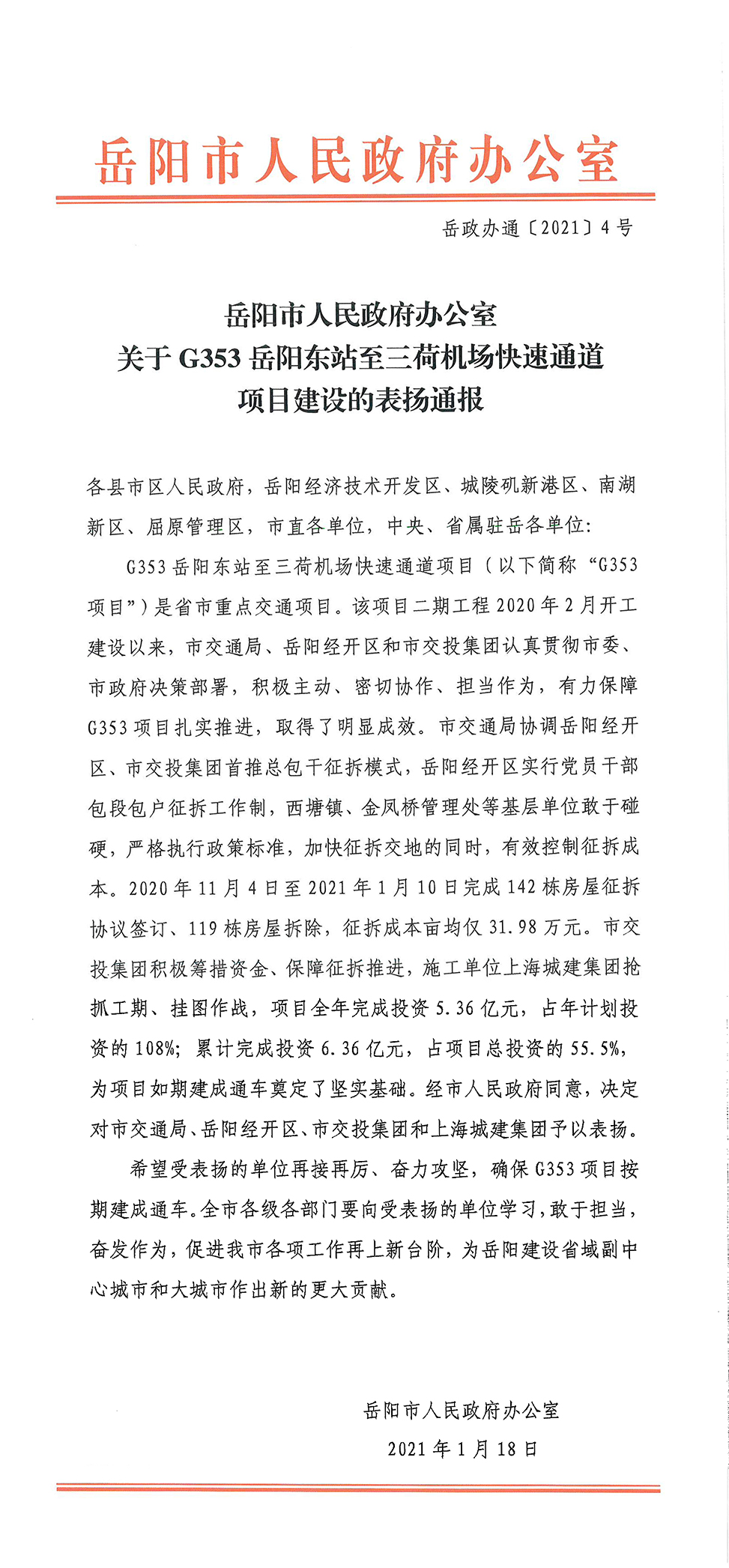 關(guān)于G353岳陽東站至三荷機(jī)場快速通道項(xiàng)目建設(shè)的表揚(yáng)通報(bào)