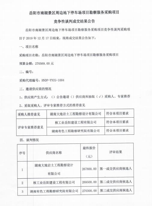 岳陽(yáng)市南湖景區(qū)周邊地下停車場(chǎng)項(xiàng)目勘察服務(wù)采購(gòu)項(xiàng)目 競(jìng)爭(zhēng)性談判成交結(jié)果公告