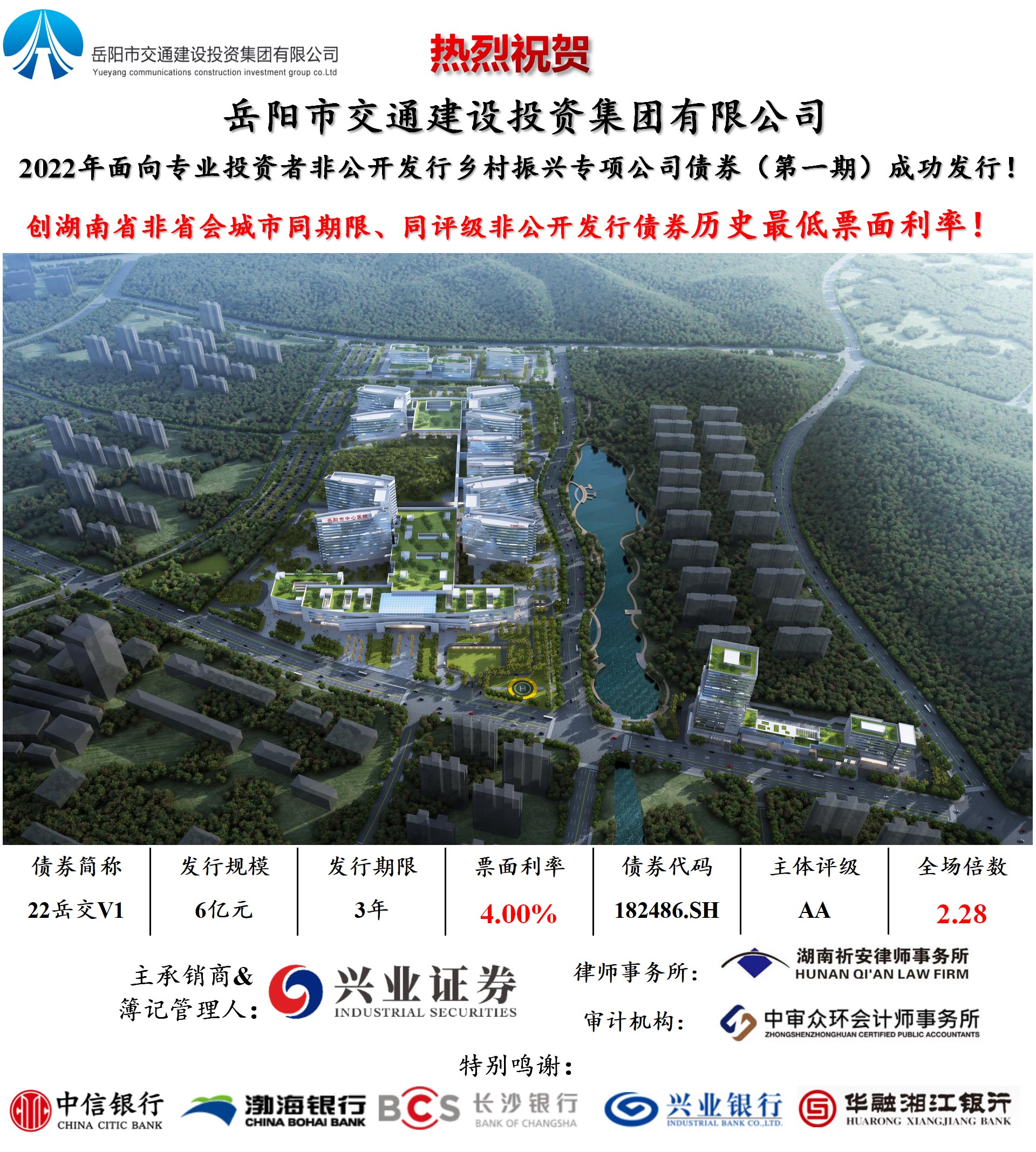 8月29日,岳陽市交通建設(shè)投資集團(tuán)有限公司2022年面向?qū)I(yè)投資者非公開發(fā)行鄉(xiāng)村振興專項公司債券(第一期),債券簡稱“21岳交V1”已順利完成發(fā)行,發(fā)行金額6億元,發(fā)行利率4.00%,全場倍數(shù)2.28倍,期限3年期,資金繳款日9月1日。